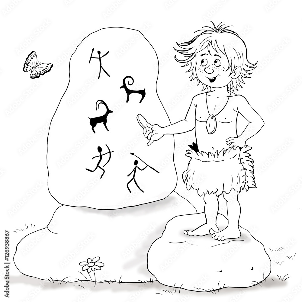 Jaskiniowcy Slodki Chlopiec Rysuje Rozne Sceny Polowania Na Duzym